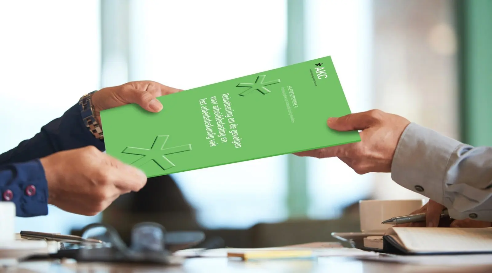 Twee personen geven elkaar een groene publicatie van het AKC aan een bureau.